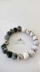 The Essential Evergreen hand-crafted bracelet is a beautiful circle of three different stones. The center lava stone disc is flanked on both sides by two 10 mm Green Line Jasper natural stones. The circle is completed by 8mm Prehnite stones. There is also a companion necklace made in similar style.